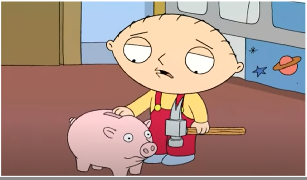Family Guy is an American animate TV series known for its crass humour and absurd storylines. The series focuses on one main character, Peter, along with his wife, three kids, and talking dog named Brian. This scene features a scene between the youngest son Stewie, a baby who can talk, and Brian.